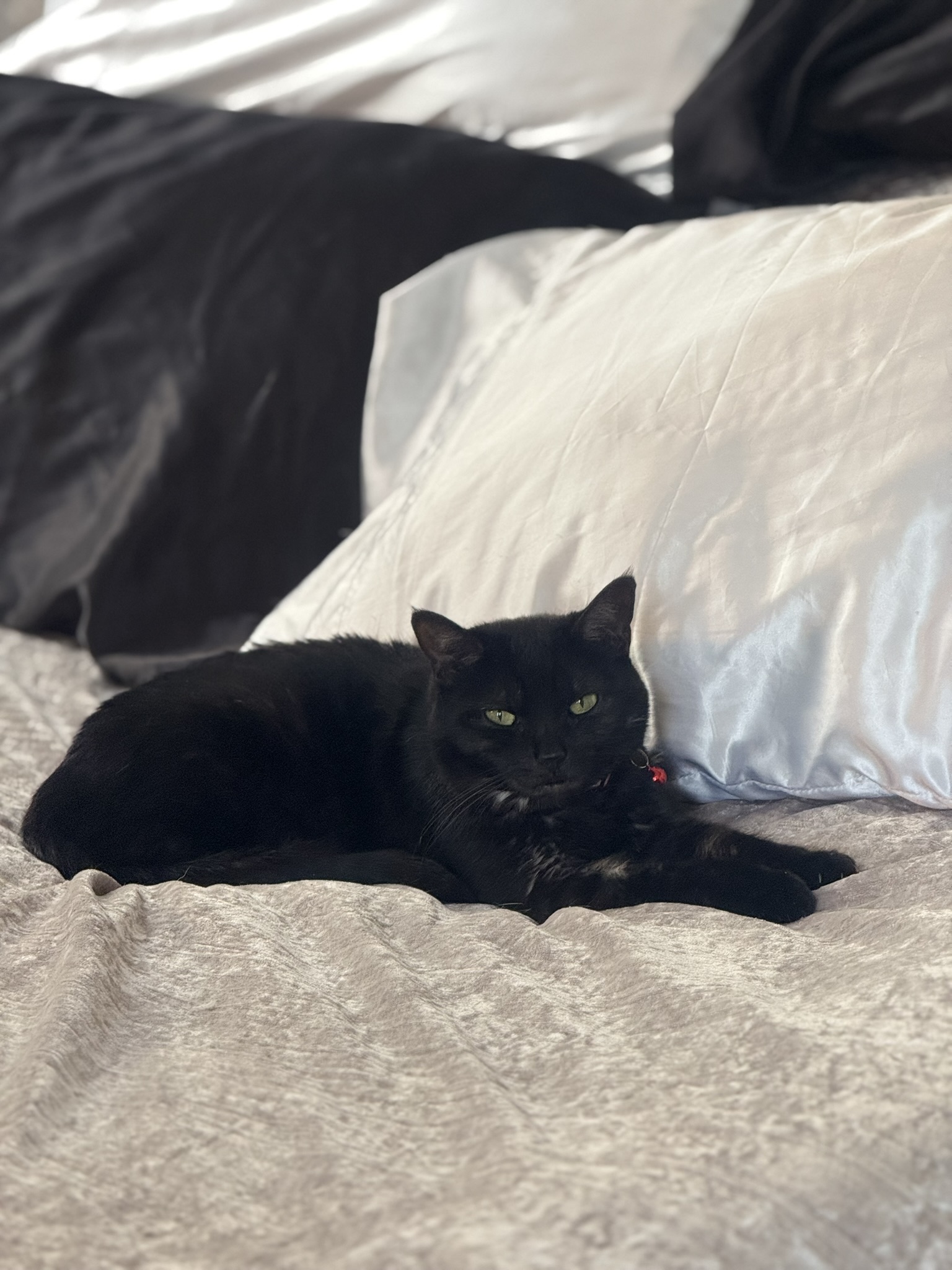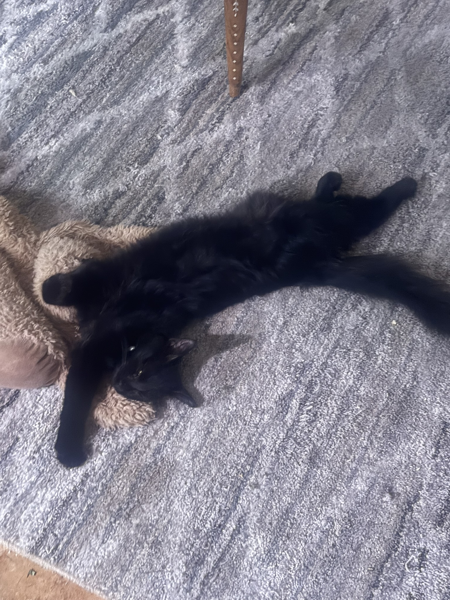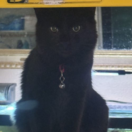 Moggers is currently listed as a Fuzzy black kitten, but don't let that fool you—he is going to be a big cat. He is a Domestic Long Hair boasting deep black beautiful fur, medium to long hair, a truly magnificent and big fluffy tail, and massive, stunning greenish yellow eyes. While he keeps his fur really clean and is generally low maintenance for a fluffy boy, his size ensures he will hold court over your living room.